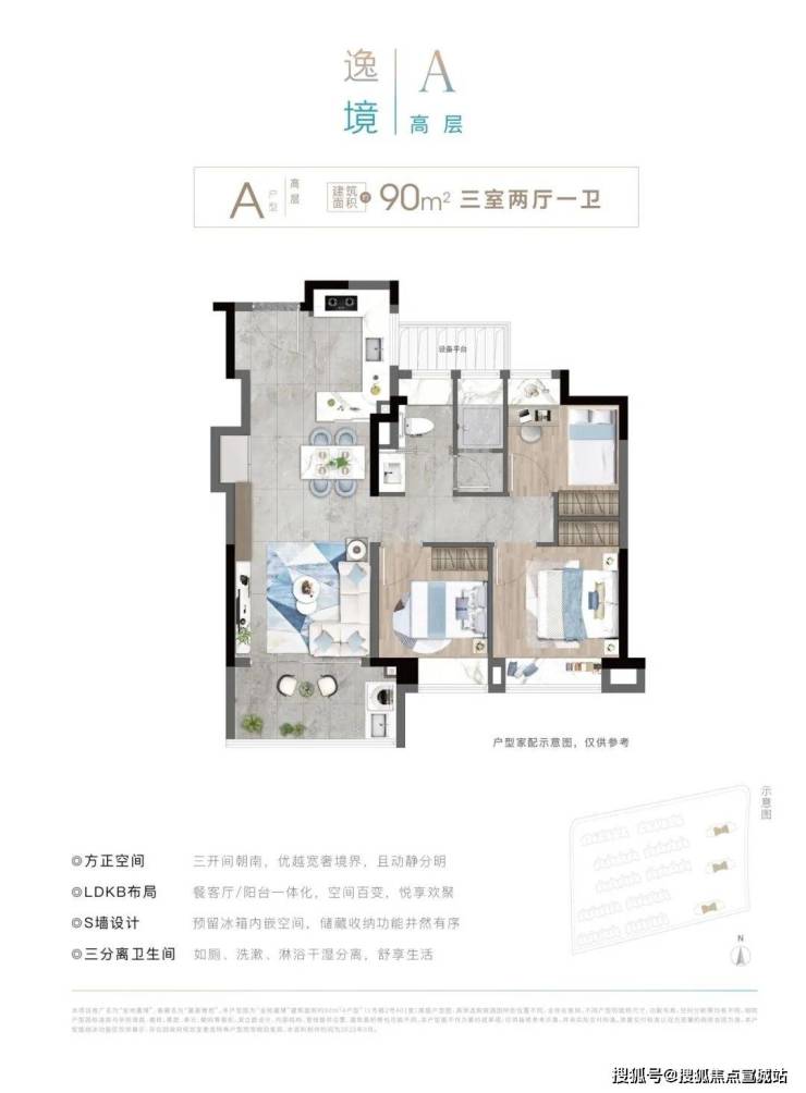 金地嘉境目前主力在售建筑面积约90㎡高层户型,总价约300万起!该户型功能性上做到3房2厅1卫,格局上实现了南北通透+三开间朝南,