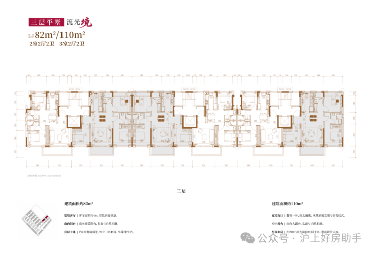建面约82㎡2房2厅2卫/110㎡3房2厅2卫(三层上叠):