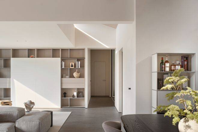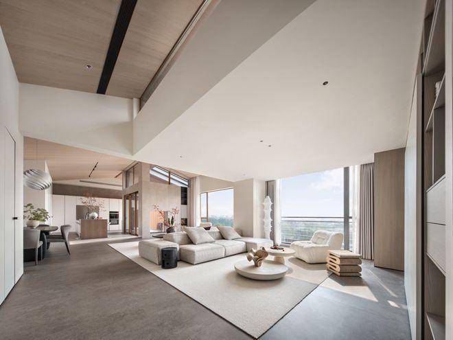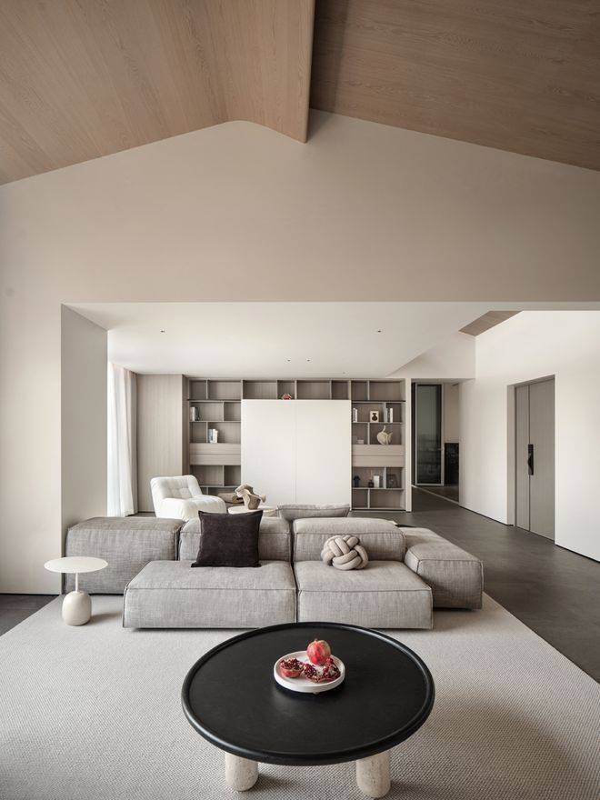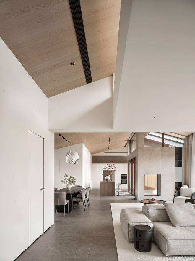 坡形顶的设计不仅提高了空间的视觉高度,也增加了空间的层次感和个性化艺术美感。通过巧妙隐藏空调风口等设备,整体空间变得简约干净。