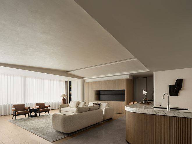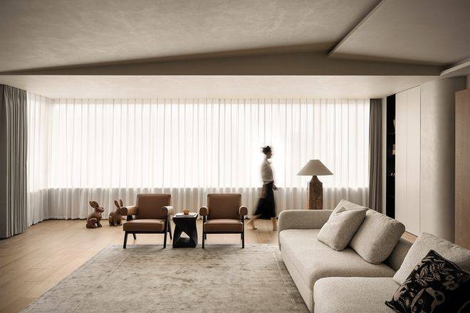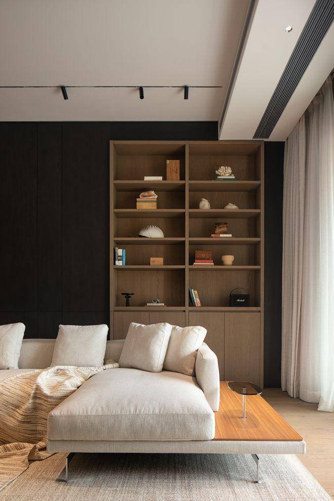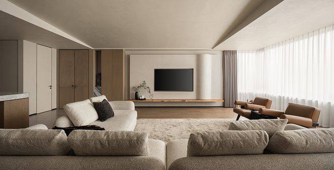 空间内随处可见的留白是设计赋予居住者自由思考的维度,同时也是空间灵动感的源泉,浅色地毯、L型沙发、皮革躺椅让家充盈且实用了起来。