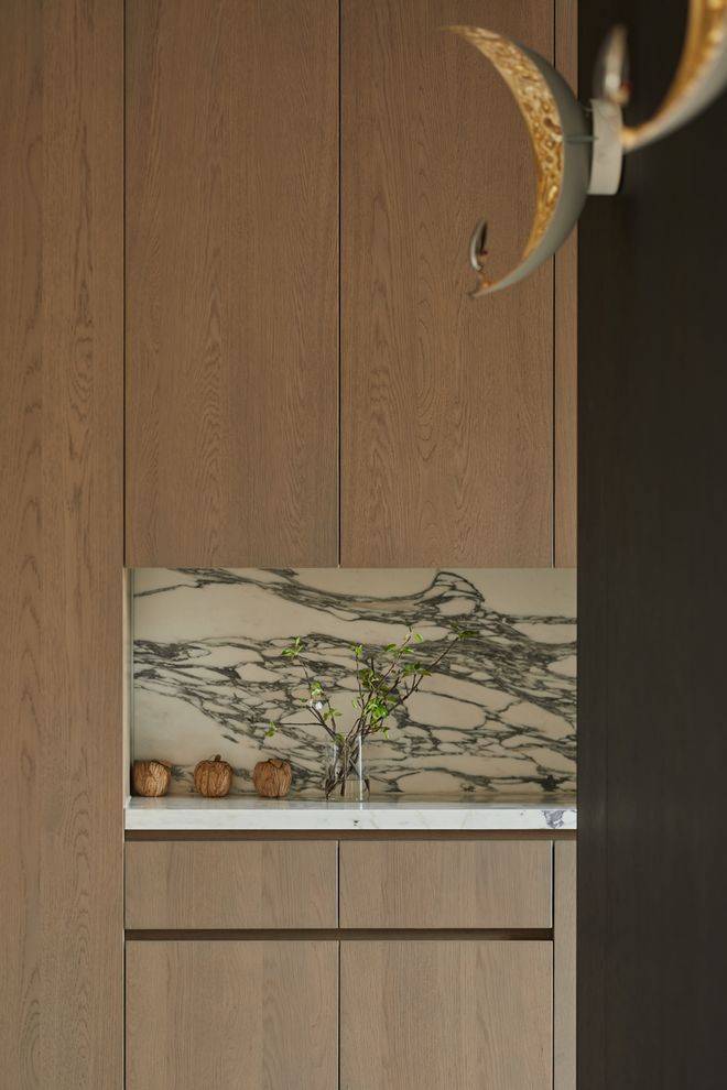 我们有意识地避免过度装饰,追求一份随性自在的松弛。空间中的质感、肌理、颜色给人的感触是温润的。深黑素雅的墙面,给予想象的静谧感;在暖色光源的照射下,如同温柔的拥抱;天然洞石拥有接近自然表皮的肌理,有着拙朴之美,带给人安定的情绪。