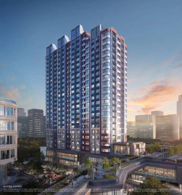 比如,选取珍珠蓝、香槟金、海派砖红等色彩,约270°圆弧建筑立面。