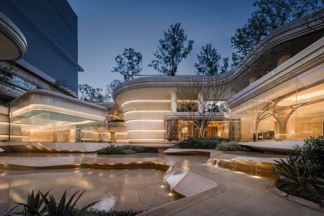 项目示范区整体延续这一设计理念,从入口大门到下沉庭院,总体布局灵感源自峡谷意象,以中央大花园为核心展开,以层层蜿蜒的大理石勾勒峡谷般的流动感。叠级曲线设计仿若水纹,营造出富有层次感与自然韵律的空间体验。