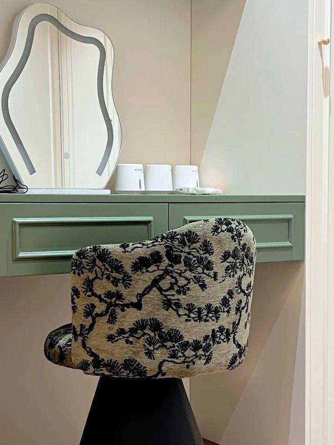 另一间卧室则以深墨绿软包床头碰撞浅灰床品,沉稳又耐看,球形吊灯的暖光落在床面,搭配简约白纱帘,营造出安静助眠的氛围。嵌入式收纳柜与洗衣区巧妙融合,既满足实用需求,又保持了空间的整洁通透,无论是自住还是待客,都能感受到松弛的舒适感。