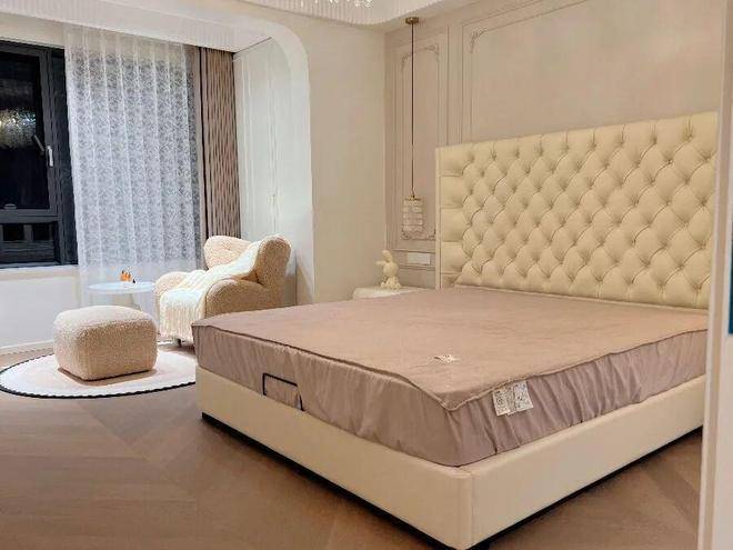 主卧以奶油白护墙与弧形线条奠定优雅基调,高定拉扣软包床头大气精致,垂坠感十足的玻璃吊灯为睡前时光镀上暖调柔光,窗边的泰迪绒单人椅与圆几,构成了专属的放松角落。通顶衣帽间兼顾收纳与通透感,让更衣、洗漱动线流畅高效,在静谧中藏着不费力的高级感。