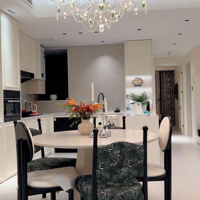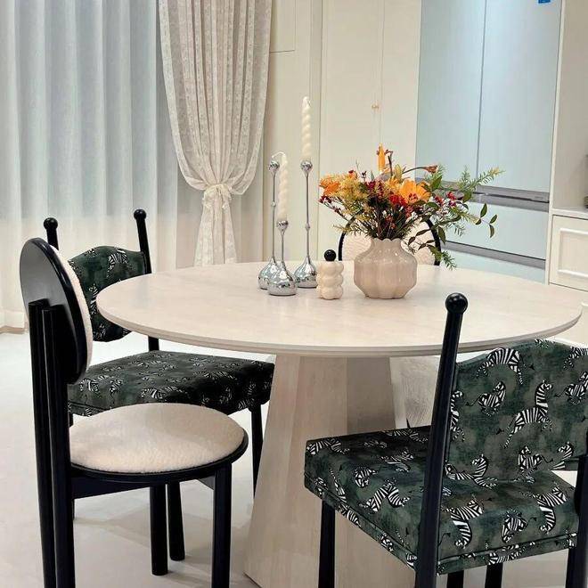 餐厅居于空间核心,串联起客厅与厨房,天然带着聚拢家人的温柔气场。圆形大理石餐桌搭配利落的几何桌腿,温润细腻,质感十足,搭配斑马纹复古餐椅,每一次落座都像赴一场浪漫的家宴。餐桌上方的水晶吊灯垂落着细碎光影,暖光轻裹着桌面,将三餐四季的烟火气与法式浪漫揉进每一次围坐里。