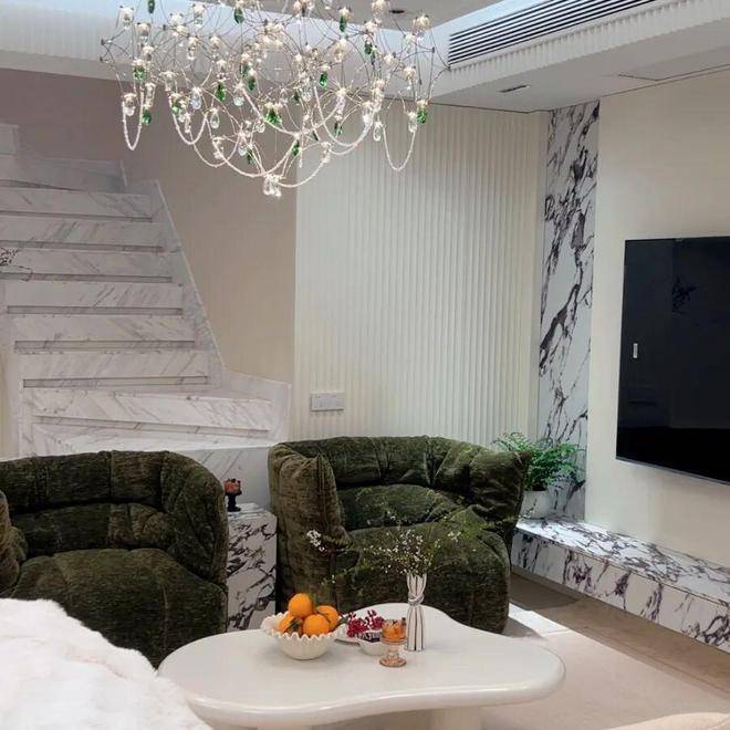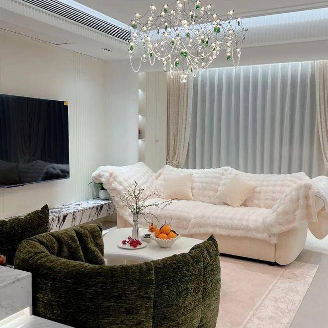 客厅以奶油白为基底,通刷暖调乳胶漆,搭配简洁法式石膏线勾勒轮廓,摒弃满墙雕花堆砌,于细节处藏着优雅。墨绿绒布单人椅柔软饱满,像被云朵轻轻包裹,搭配奶白色毛绒大沙发,低饱和色调碰撞间,让松弛感拉满。电视背景墙以天然大理石纹理点缀,利落又高级,悬浮式岩板电视柜兼顾收纳与美感,闲暇时窝在沙发里,看水晶灯光影流转,便是最治愈的日常。