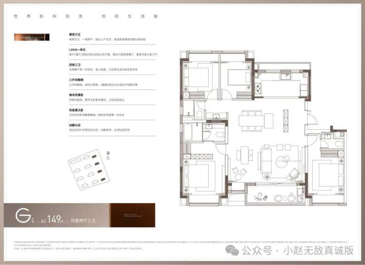该户型最大亮点在于 “3 卫” 配置,区别于市面上超98% 的150㎡四房两卫户型,可打造双南套房,充分保障家人的尊贵感与私密性。