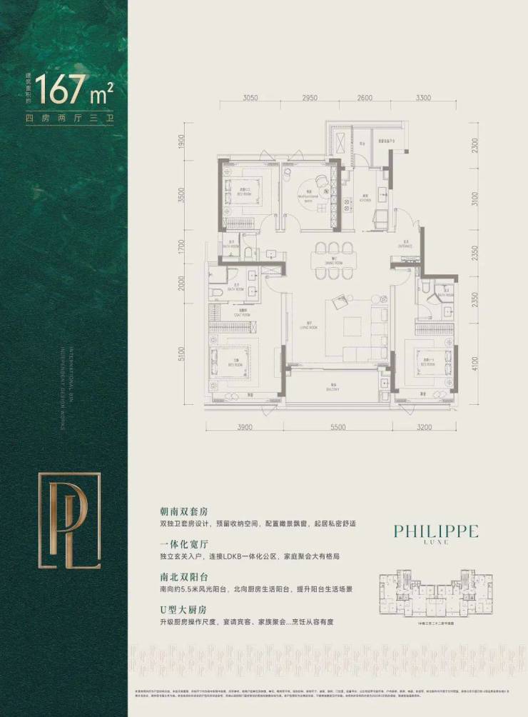 167㎡四房两厅三卫(双套房设计,约40㎡横厅)5