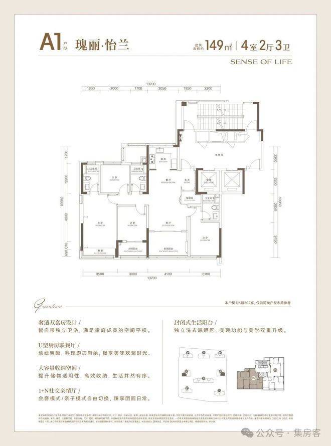 全盘两梯两户配置,标准层层高约3.1米,经典的改善盘骨相。最亮眼的,莫过于建面约149㎡主力户型,四开间朝南+南向双套房+独立储藏室,所有卧室与卫生间皆以最短动线布局,让每一厘米都服务于生活。它也是奥体在售仅有的149㎡入门级改善四房,堪称实用度和流通性的年度明星!
