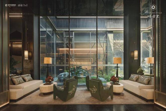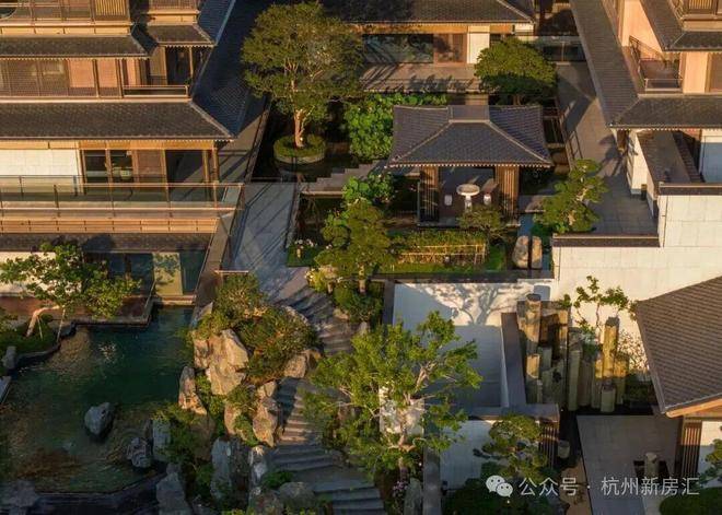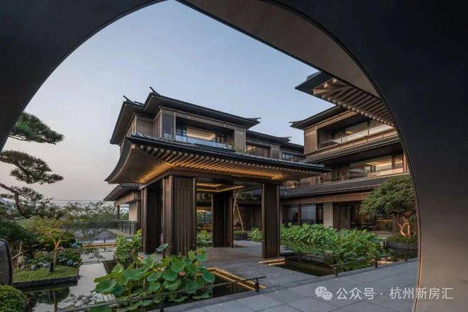 建筑立面:古今交融的诗意表达:外立面以香槟金铝板为基调,搭配蓝眼睛石材与玻璃幕墙,融合传统歇山重檐、纳福悬鱼等元素,既保留宋式建筑的对称美学,又赋予现代建筑的轻盈通透。合院组团采用三面庭院设计,L型景观面与环绕式檐廊,将超山梅影、丁山湖光引入每一扇窗景!