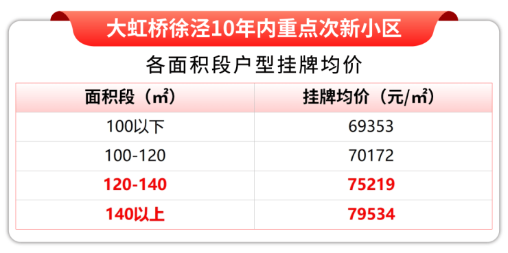 据链家网最新挂牌数据显示,目前徐泾10年内次新重点小区100㎡以下户型挂牌均价已经跌破7万/㎡。但140㎡以上的大户型却仍然有近8万/㎡的挂牌均价,溢价小户型近15%!