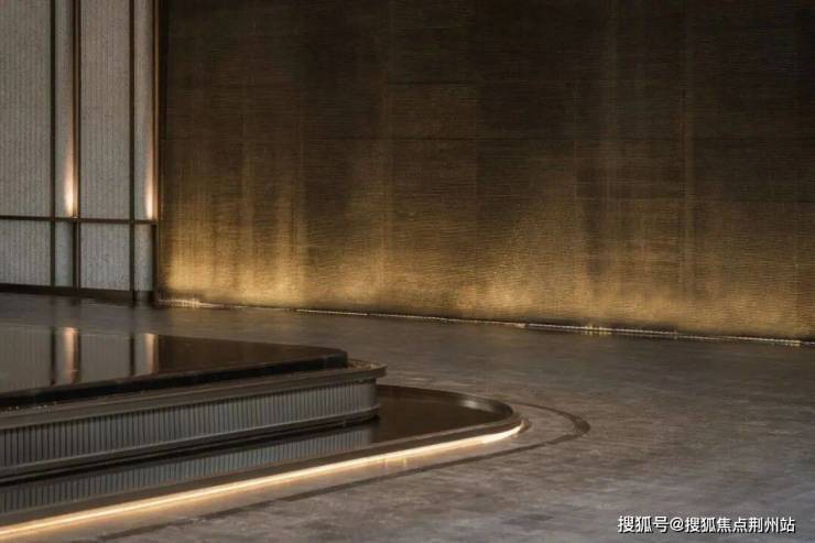 接待门厅空间大量的运用奢石和流水进行造景,蕴含“浩瀚星空”的范思哲黑奢石流水景墙,拉槽式设计结合底部洗墙灯,营造潺潺流水的静谧意境,以“流水”表达对业主的美好祝愿。