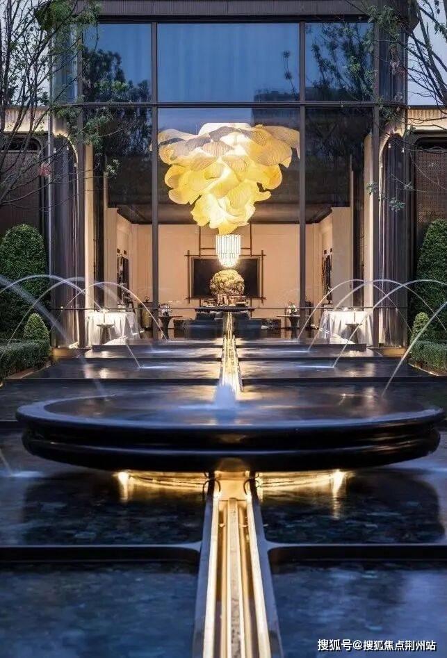 来到仪式水轴,眼前一块长20多米的蓝翡翠奢石水景,奢石如琉璃般晶莹剔透,两侧序列的涌泉演绎生动、优雅、精致的生活场景,给人一种静谧、典雅的空间氛围,彰显着酒店式奢华品质。