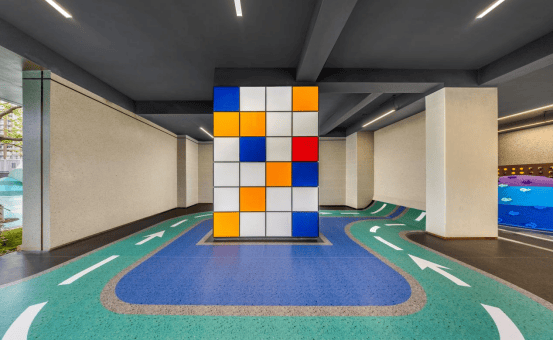 架空层入口处则以明快丰富的色彩与开阔的空间感,构建出充满想象力与安全感的儿童友好环境。每一处圆角处理、每一寸软质地面、每一盏柔和灯光,皆于细微处流露对儿童的贴心守护与生活质感。