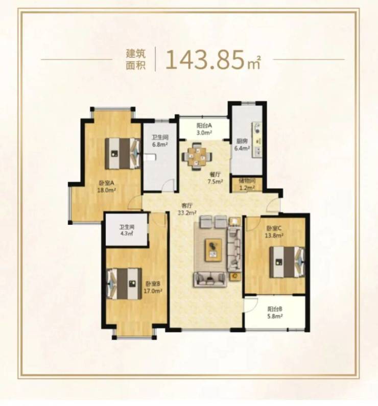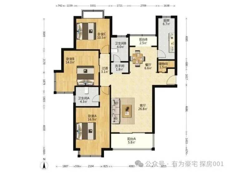 3、 三居室:公房面积:60-90平米;商品房面积:110-150平米;