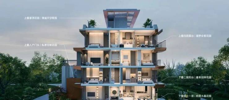 不止做了架空层,数量更是高达9个。下沉式会所则包含了多功能厅+泳池+健身区+超大水景庭院。