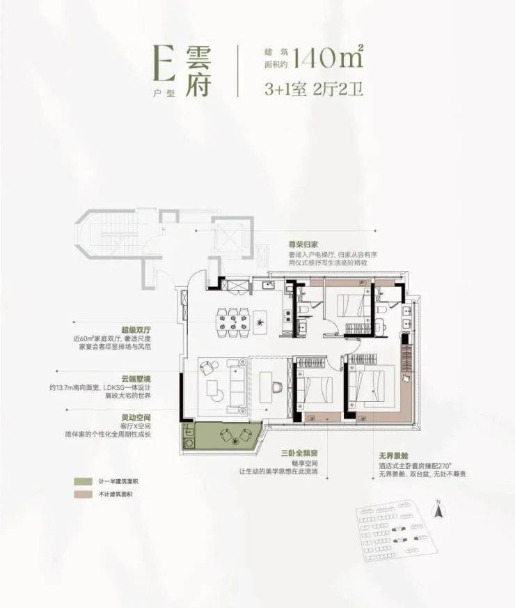 建筑面积约140㎡,四开面朝南设计,南向面宽达13.7米,采光和通风效果极佳;