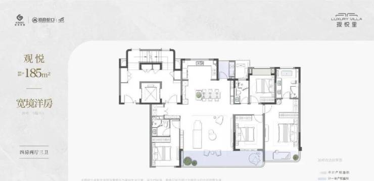 洋房:185㎡四房两厅三卫(精装交付,得房率超80%),南向落地窗设计