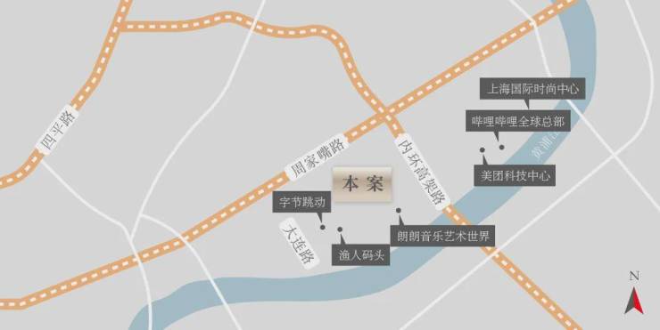 项目位于杨浦内环内,轨交方面距离12号线和18号线双轨交站点江浦公园只有约500米;同时与黄浦江的直线距离约1.5km。