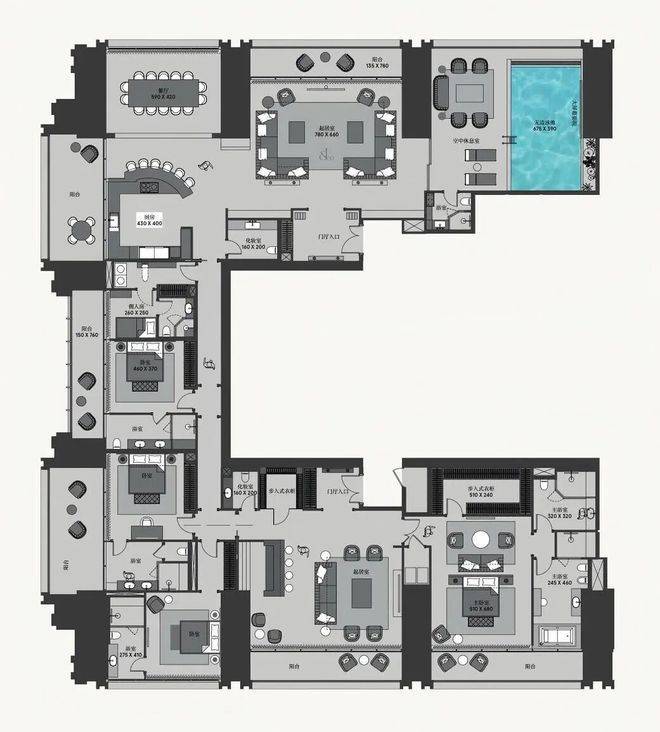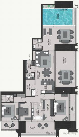 户型简介:4卧 + 7浴 + 保姆 + 学习 + 无边泳池 + 健身房 + 4车位