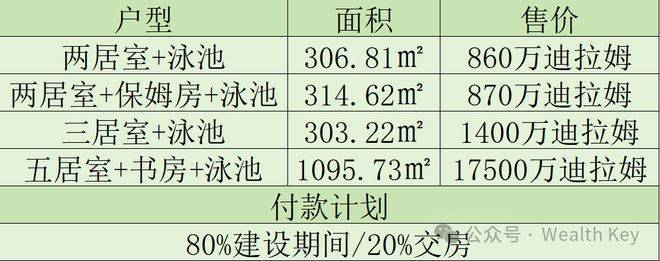 付款计划:首付20%,建筑期间60%,交房20%
