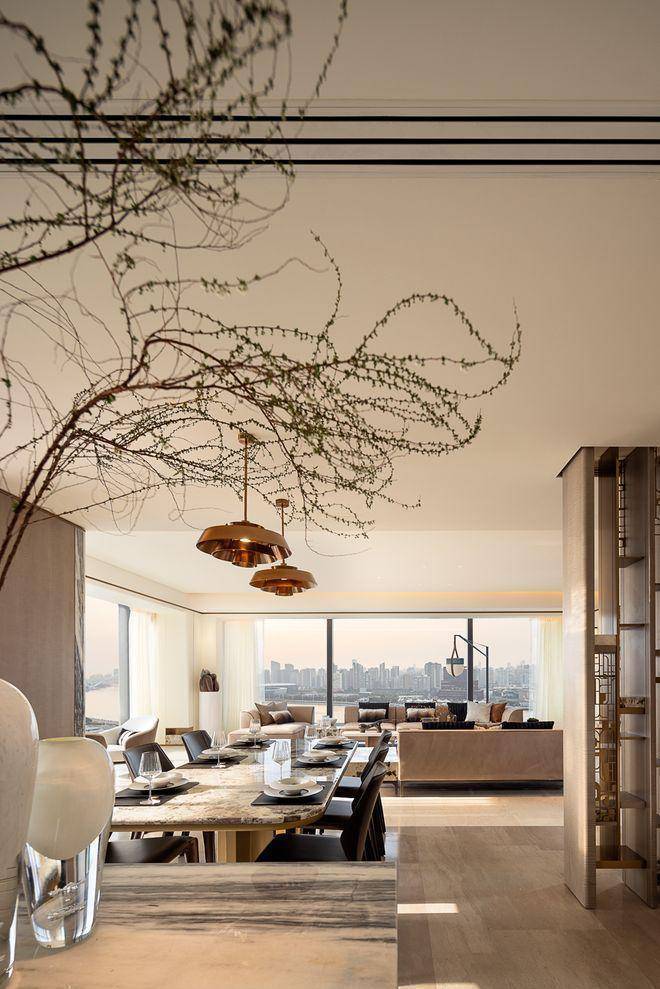 客餐厨顺势衔接、浑然一体,无一丝多余设计,美好生活的理想画卷徐徐展开。窗外高楼林立映江景,涛声阵阵入庭来,在这天然背景中,我们化身生活的主宰,肆意挥洒灵动笔触,为日常添彩。