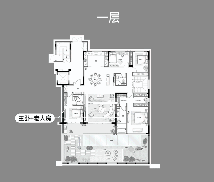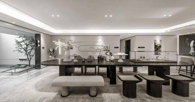 约700m²确实庞大,在空间打造上,我们关注“高低频”。客厅和双套房这些高频使用区,连通南向大花园,采光视野绝佳,充分放大体验感。阔达约60m²的客餐横厅,举步有天有地的院落场景,让全家尽享天伦之乐。像围绕客厅公卫的一圈走道,属低频区,我们便打造成“光之回廊”,方便孩子肆意跑动,升华空间功能。