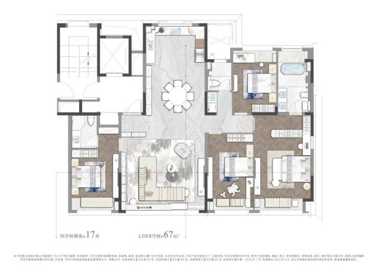 约 17 米殿堂级开间,搭配尊崇独立电梯厅,赋予每一次归家仪式感与尊崇感。三卧室朝南布局,确保充足阳光洒入室内,营造明亮舒适的居住环境,彰显高定起居风范。