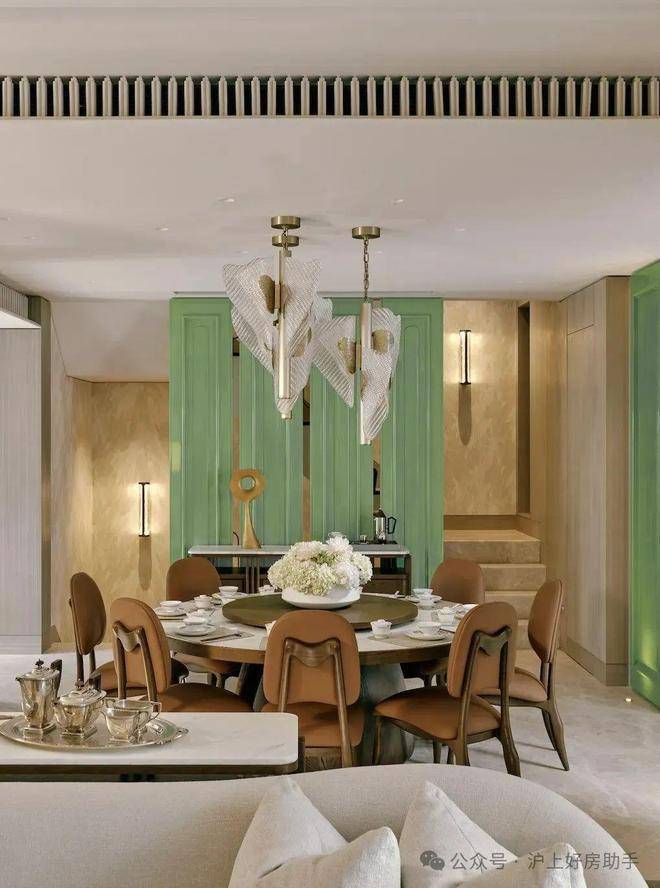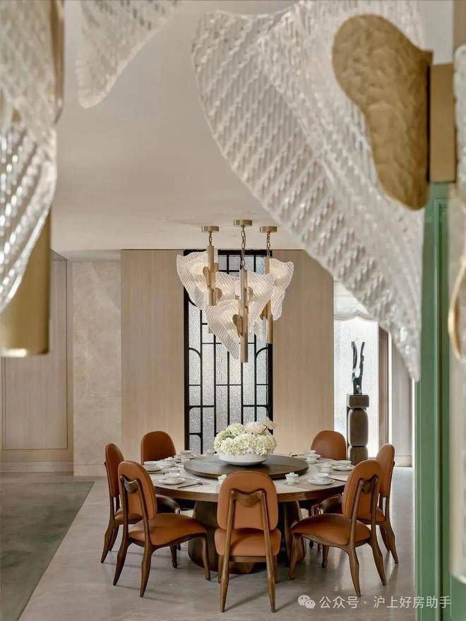 餐厅的设计巧妙融合了老上海的经典元素,圆形餐桌和橘色皮质餐椅在色彩上既现代又充满活力,顶部的水晶吊灯造型灵感来自上海市花“玉兰花”,既增添了空间的华丽感,又巧妙地融入了上海的地域特色。