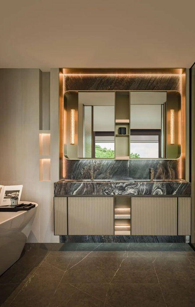 细密精致线条的木饰面与高贵石材结合奠定了经典纯粹的美感。所有休憩空间全部采用无主灯设计,柔和布光,且从公区到衣帽间,至卧榻一步步光影由明转暗,逐步带来放松的感受。