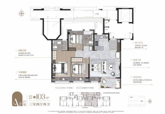 项目建面约103㎡3房同样是三开间+大横厅的布局,但尺度上更进一步。而且灵动空间更多,全屋飘窗+南向观景阳台,提升性价比的同时也增强户型对外的延展性。