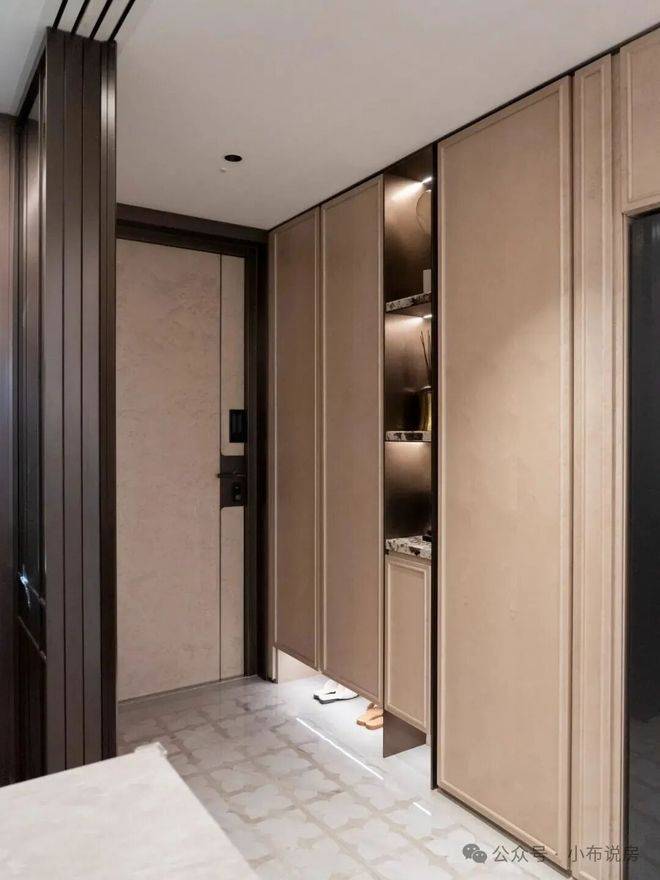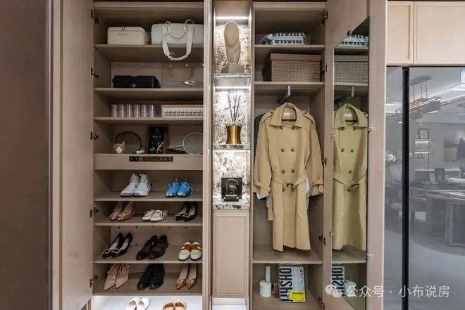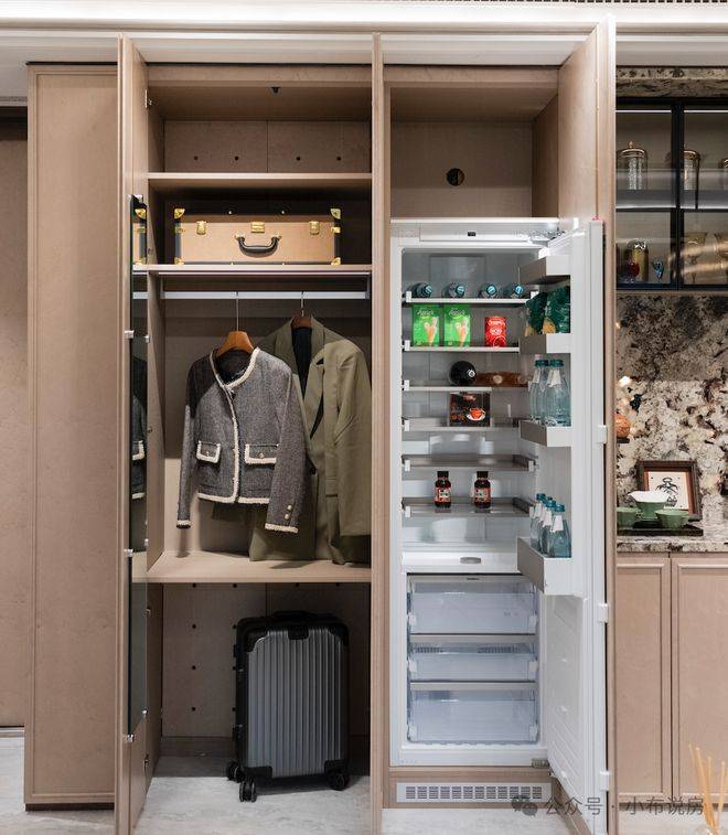 137㎡户型在此基础之上叠加“雪山银狐”奢石壁龛,小件随手即归位,行李箱、滑雪板、登山杖等大件也有独立空间,抽拉、拿取都在一步之内。冰箱柜被巧妙“藏起”,维持立面干净统一。