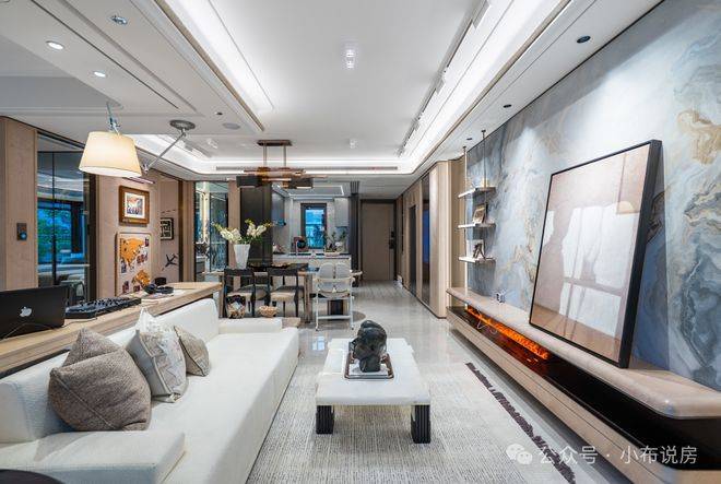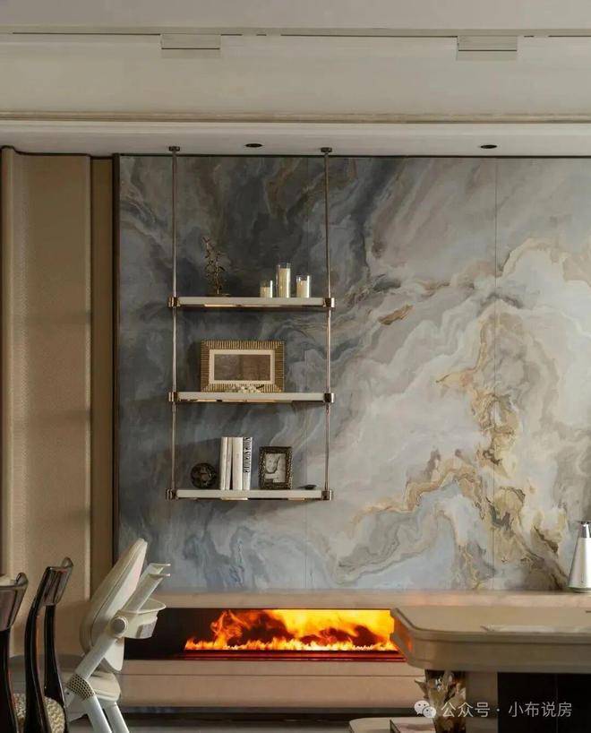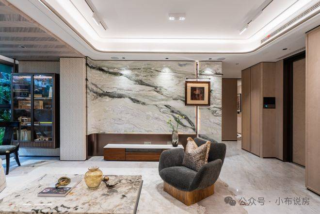 材质与工艺上,100户型的背景墙选用幻日流光岩板,看上去就有一股低调的奢华。