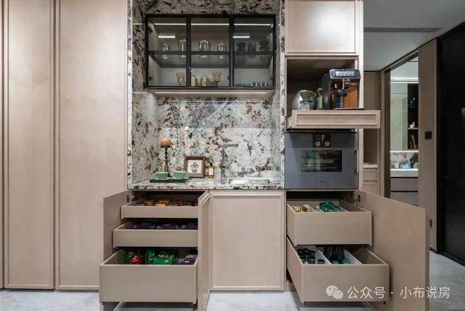 更具代表性的是137㎡户型的餐边柜,它与操作台、洗手台组合成复合工作站——咖啡机、蒸烤箱、酒柜、日常餐具按功能分层,把所有抽屉拉开,收纳空间的容量非常惊人。在这一方空间里,朋友小酌、业主轻烹......一张台面完成多场景无缝切换。✅保利外滩启Park77售楼处电话:400-9688-923✅︎✅︎✅
