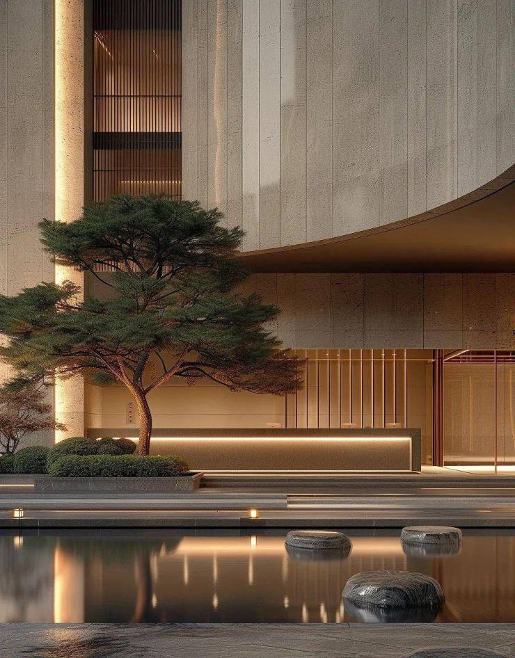 由goa大象设计执笔,建筑以宋代美学为灵感,以蓝眼睛石材的温润、超薄铝板的轻盈、三玻两腔玻璃的通透,勾勒出“悬浮感”与“水平感”交织的东方意境。当光影流转,立面即呈现极简东方的诗意艺术韵律。