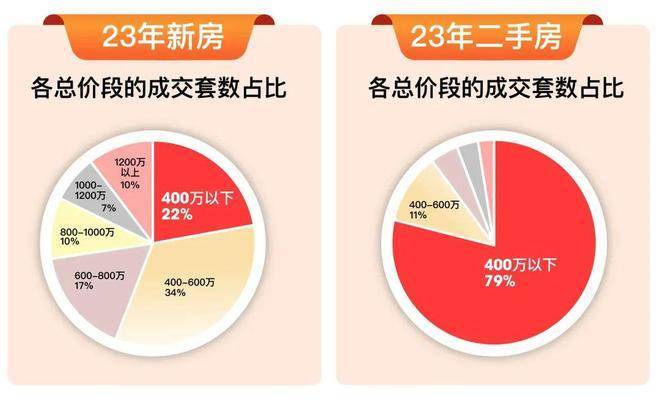 仅是2023年,总价400万以内的新房就已成交近1.2万套,占比约22%。而在二手房市场,这一数据要高上7.6倍,总价400万以内二手房成交9.16万套,占比约79%。