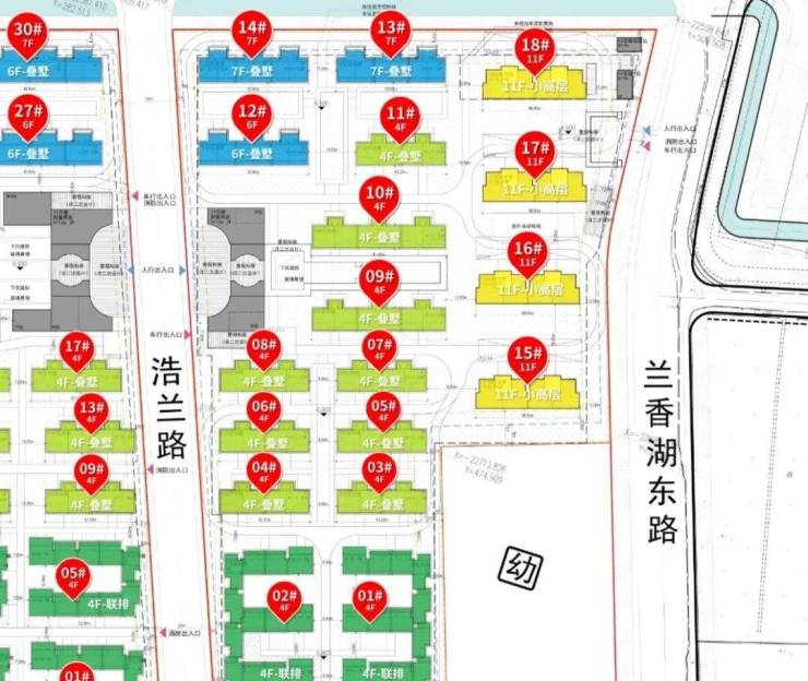 小高层楼间距约30米,联排楼间距约12.84~13米,4F鲁墅楼间距约16.3~22米,6-7F叠墅楼间距约20.1米左右!