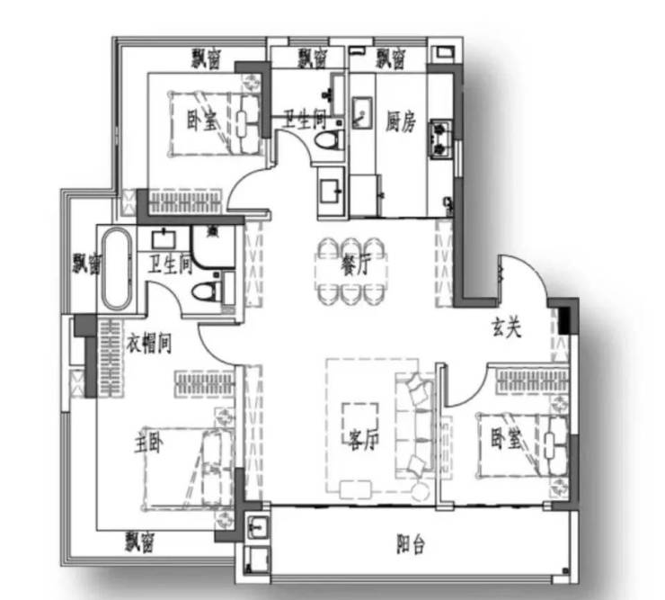 边套户型主卧以及北房间均为270°飘窗,另外主卫也带飘窗!