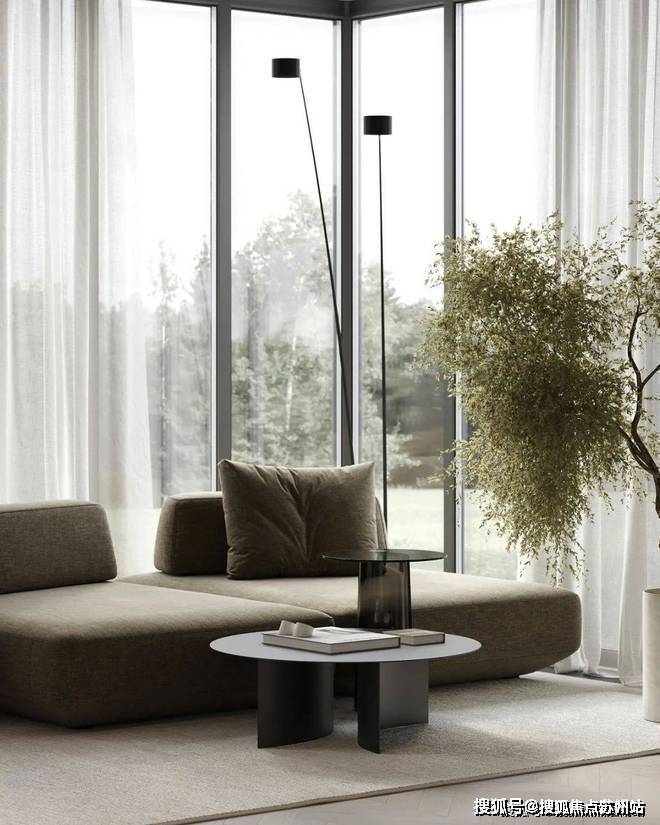 苏州上华璟庭售楼处电话☎:400-8118-224(售楼处预约看房热线)客厅中,设计师选用暖灰色作为空间的主色调,搭配上原木色的地板,奠定现代极简的空间基调.灰绿色的布艺沙发搭配上圆形的小茶几,展现出空间的几何美感.沙发旁摆放着绿植,为室内空间增添了一抹色彩,呈现出现代空间的生活美学.