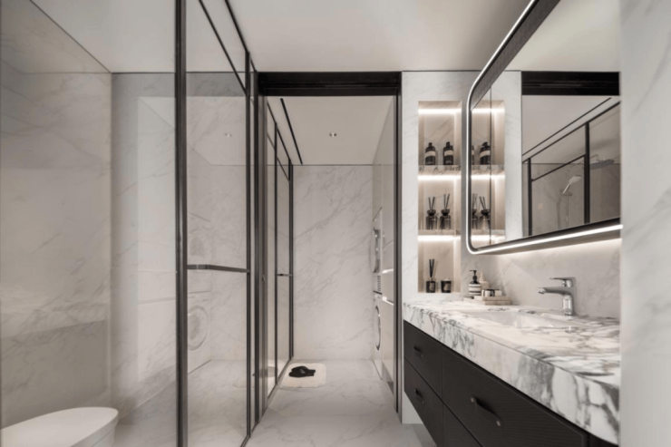 对标五星级酒店的四分离设计,把洗漱台、卫生间、淋浴间、洗衣区彻底分开,再配汉斯格雅花洒(或同等品牌)、伊奈智能马桶(或同等品牌),连家政间都藏了洗烘套装—— 有孩子的家庭再也不用 “早上排队洗漱”,细节里全是对生活的尊重。