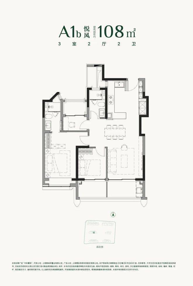 建面约108㎡3房2厅2卫:该户型最亮眼的便是三阳台设计,整体尺度感足以碾压市面上约120㎡的户型。