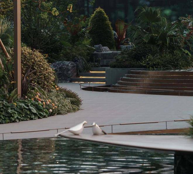 首先,大华公园柏翠利用12级叠水、2座树池、9步水上汀步,运用六重造景的手法打造近500平的中央水景!