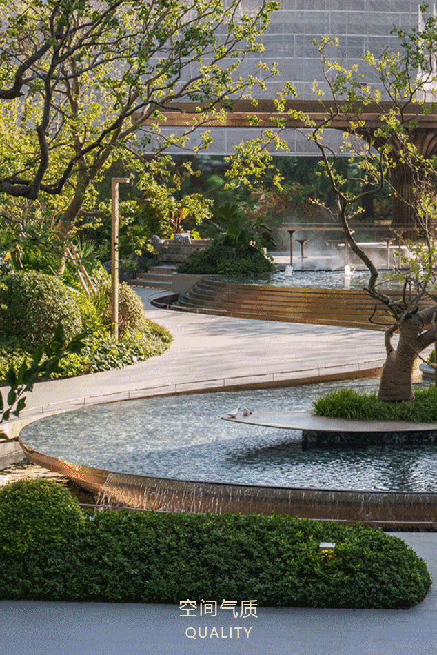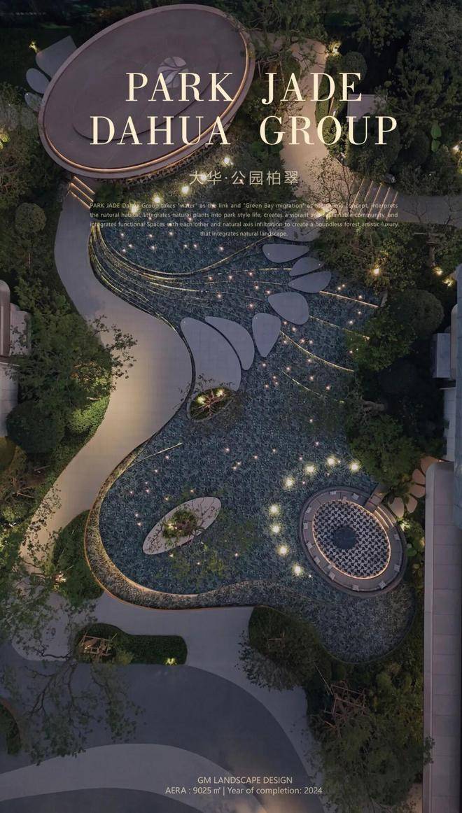 并且将中心场地抬高1米,在水系池底通铺1300多片的PRADA绿石(仿石砖)、精选斜飘乌桕、造型紫薇等名贵树种...
