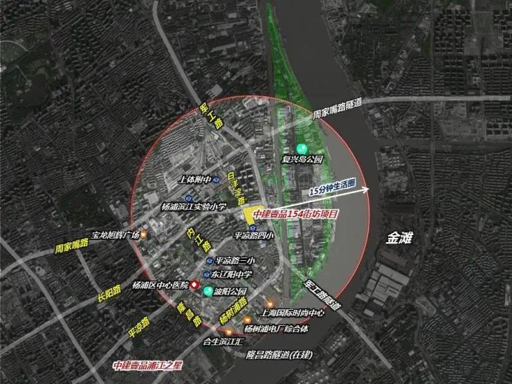 定海街道154街坊项目【即中建壹品·外滩源著】四至范围:东至军工路(中环)、南至平凉路、西至规划白洋淀路、北至长阳路。
