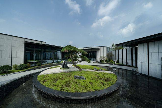 还未走进大堂,就能透过一侧镂空,窥到园内苍松云柏枯山水的写意美景。内外联动,别有一番趣味。