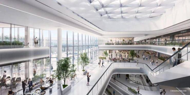同时,为了融合建筑、景观、室内与周边环境,打造出独一无二的景观体验,内部整体设计了市民广场、露台以及森之庭院等空间,塑造人们与自然相处的场地。在这里,可以远眺湿地风光,也可以近瞰世界级中轴的繁华盛境;在这里,承载许多商业内容、文化内容和生活内容的载体,它满足科技创新发布、社交聚会以及日常所需,促进情感的交互,提升生活的浓度,成为科创新贵和全球高知的一站式生活目的地。