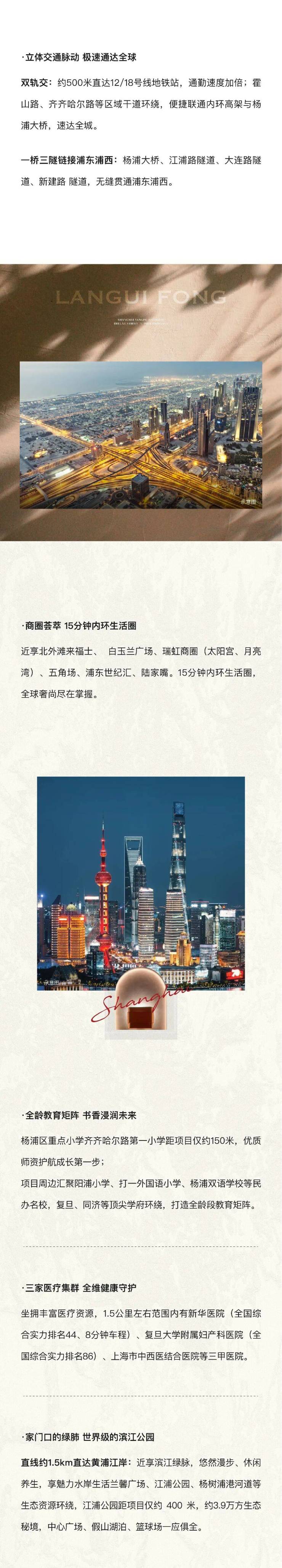 项目位于杨浦内环内,轨交方面距离12号线和18号线双轨交站点江浦公园只有约500米;同时与黄浦江的直线距离约1.5km。