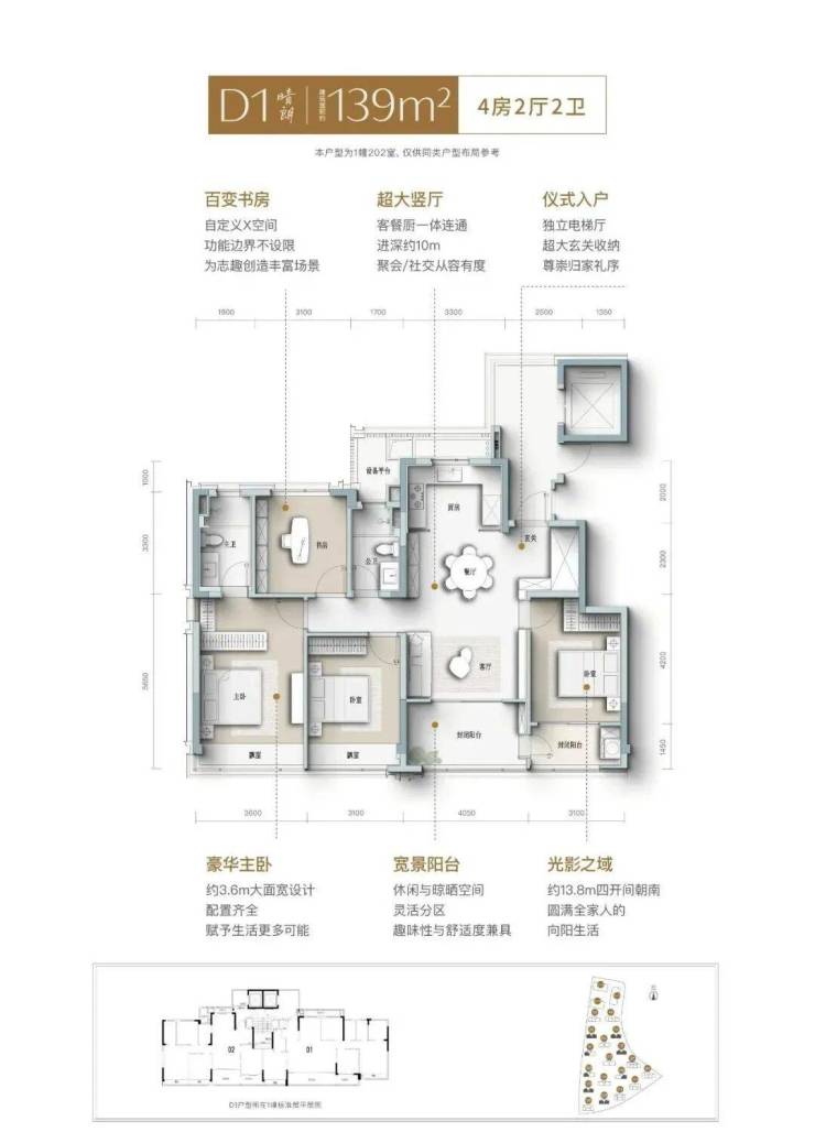 建面约139㎡南向四开间,引阳光肆意倾洒,LDK一体化宽厅,打破空间隔阂,成为家人互动、朋友欢聚的核心场域,餐厨开放式设计,让烹饪不再孤单,自定义X空间,实现“不为人生设限”,次卧家政阳台,兼顾实用与观景,约3.6米奢阔主卧,妥帖安放身心,精细化收纳,生活井然有序......