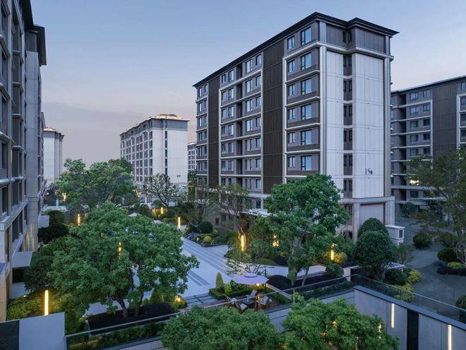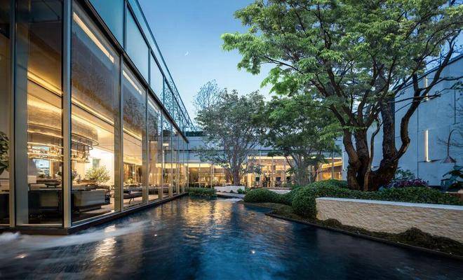 与会所一体的下沉庭院更是与周边建筑融为一体,静水流深,古树浮桥,自然错落的景观搭建营造了充满度假感的社区一角。